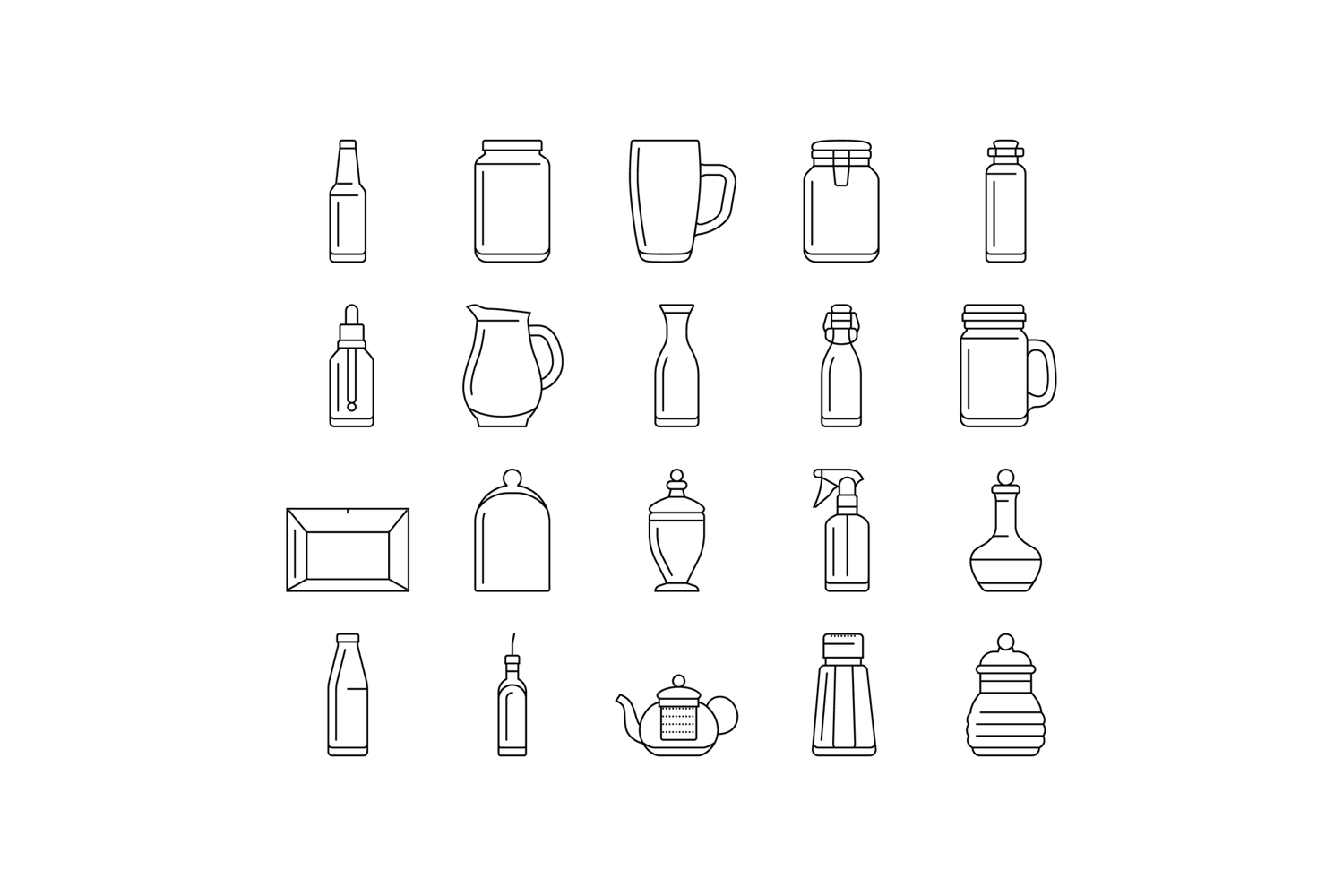 glass packaging bottle product icons set vector. food milk, pack box, jar cup, canister vial, jug, spray, lotion, salt glass packaging bottle product black contour illustrations