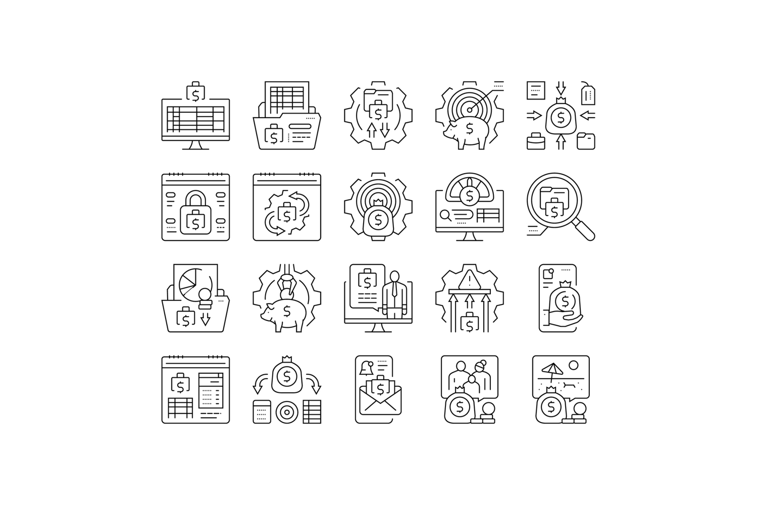 planning budget finance income icons set vector. investment cashflow, management optimization, prioritization tracking planning budget finance income black contour illustrations