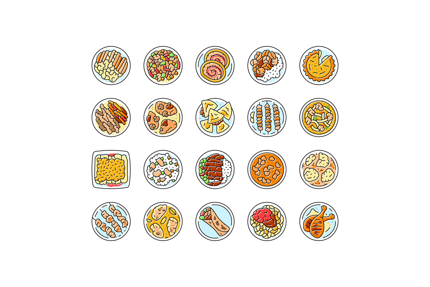 chicken dishes roast grilled icons set vector. fried baked, barbecue teriyaki, curry, casserole parmesan, piccata marsala, tandoori chicken dishes roast grilled color line illustrations
