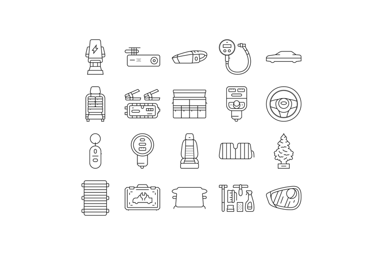 car accessories seat cover icons set vector. phone mount, dash cam, vacuum cleaner, tire pressure gauge, freshener car accessories seat cover black contour illustrations