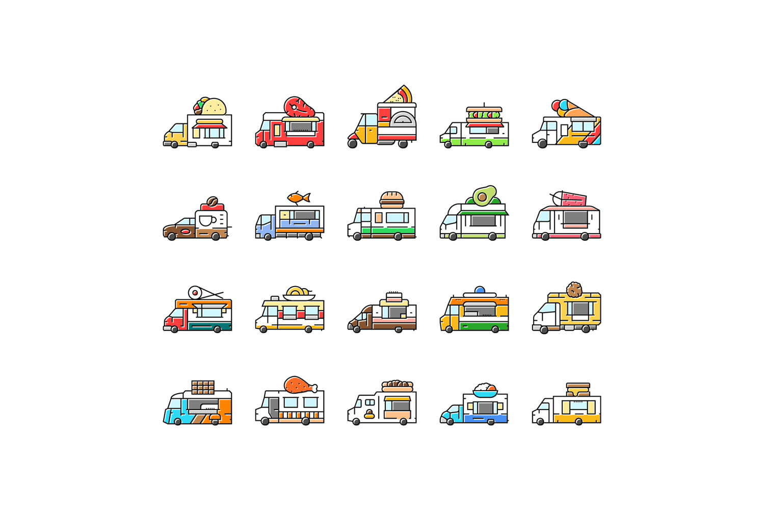 food truck street mobile cuisine icons set vector. gourmet vendor, festival tacos, burgers fusion, bbq pizza, vegan, fries, dessert food truck street mobile cuisine color line illustrations