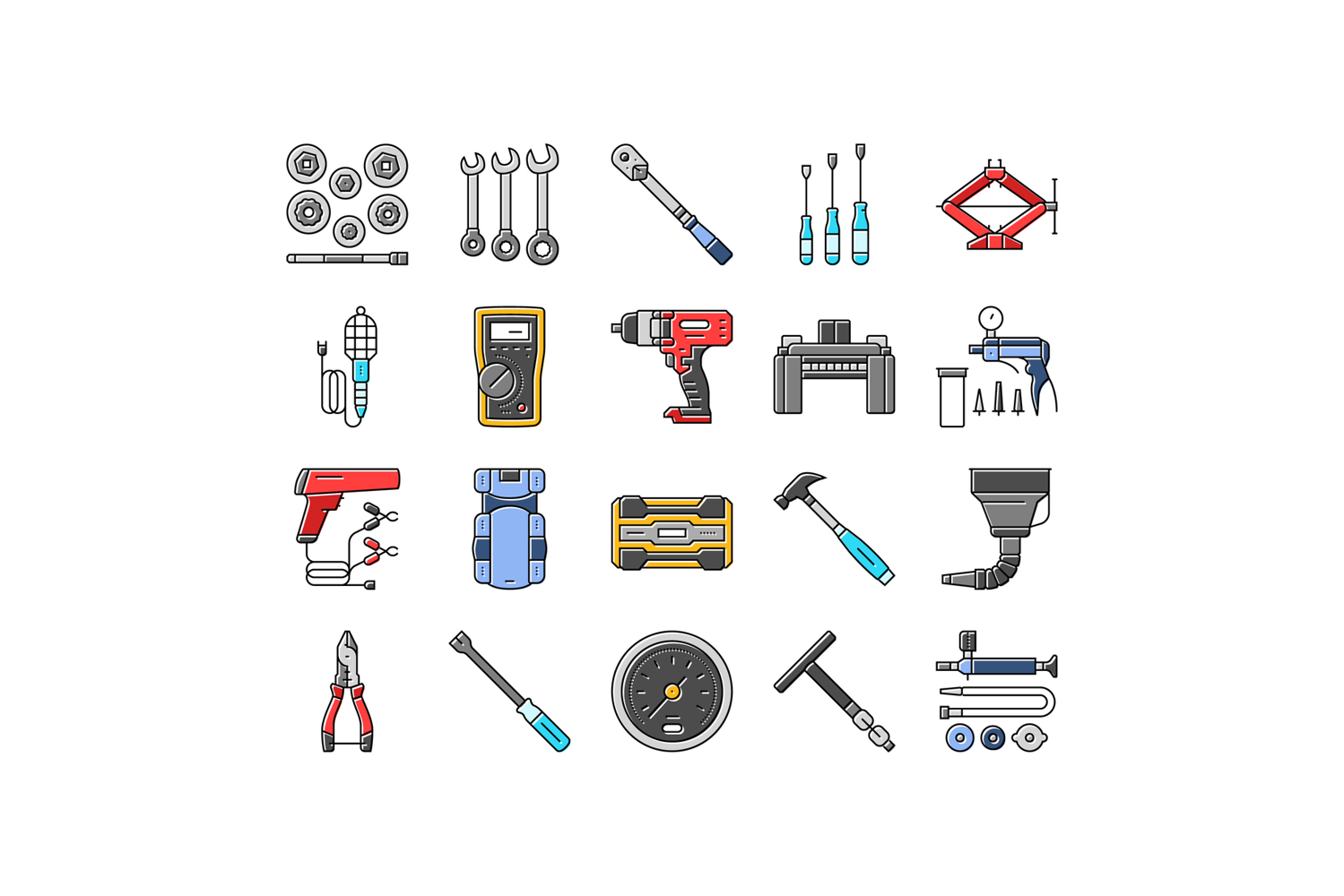 car repair tools wrench icons set vector. socket ratchet, pliers jack, lift screwdriver, multimeter, compressor, torque car repair tools wrench color line illustrations