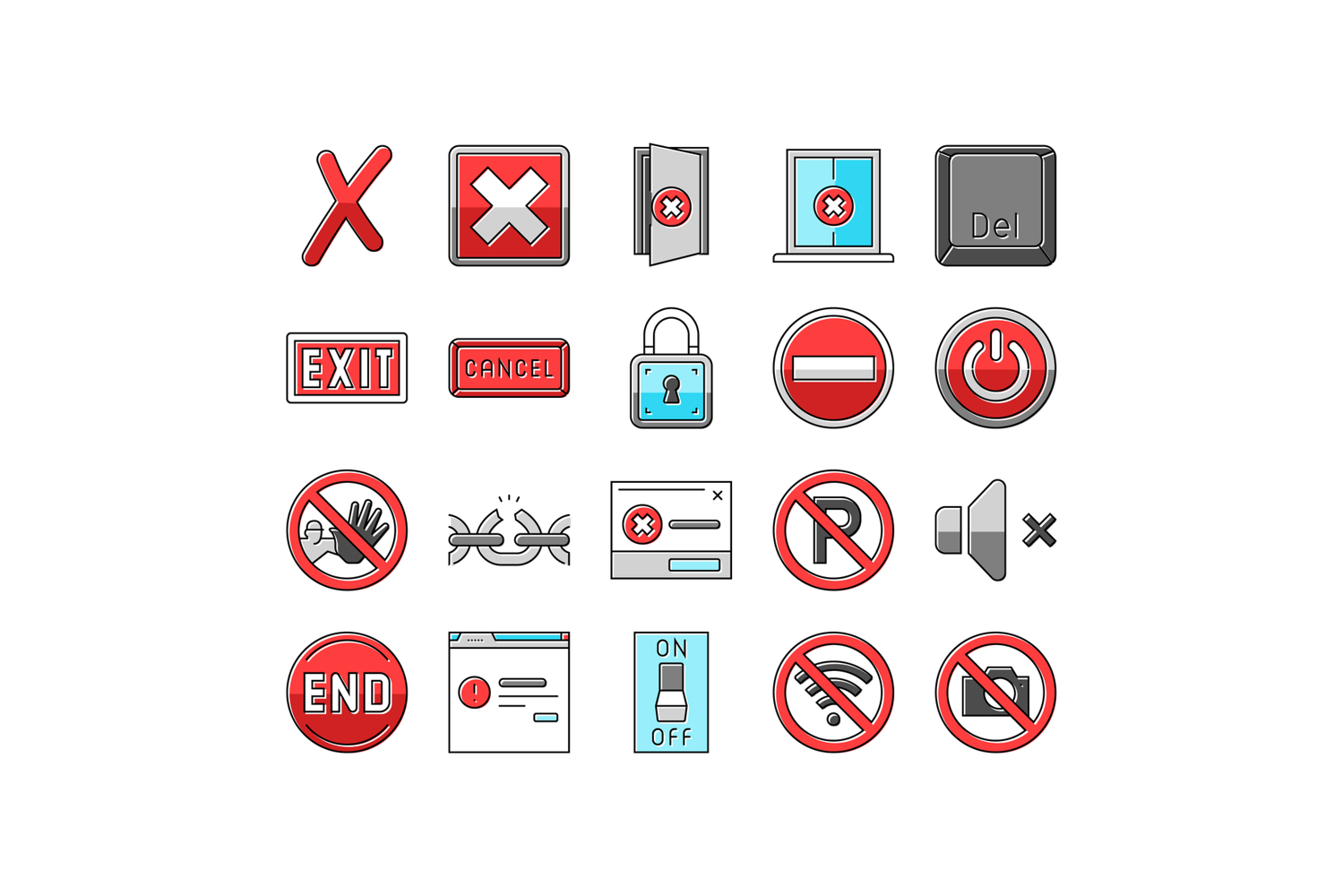 close door store shop board icons set vector. business hanging, mark cancel, office delete, x sorry, exit, check, button, time close door store shop board color line illustrations