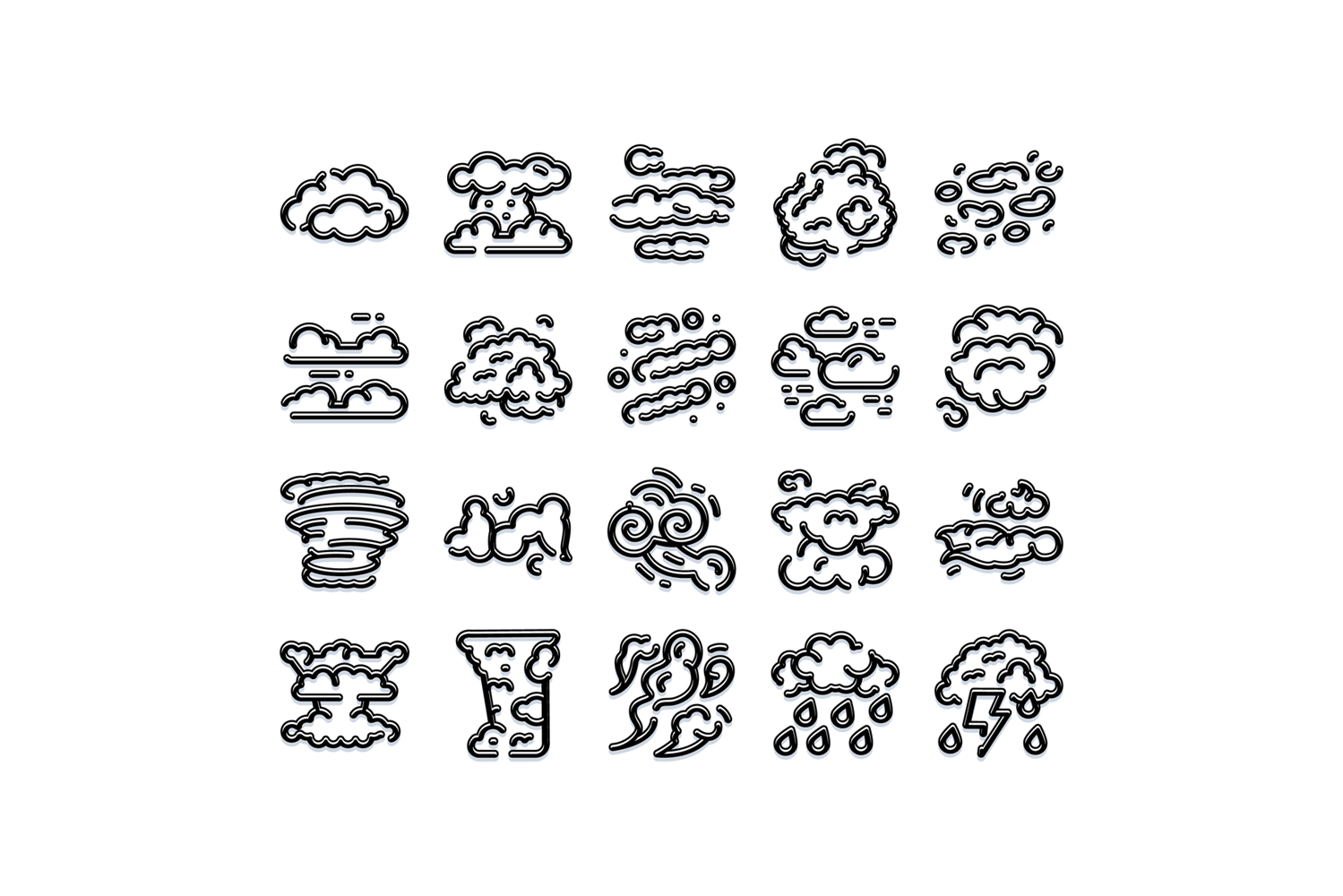 Weather icons illustrating various cloud formations, atmospheric conditions, and meteorological phenomena for climate forecasting and weather applications