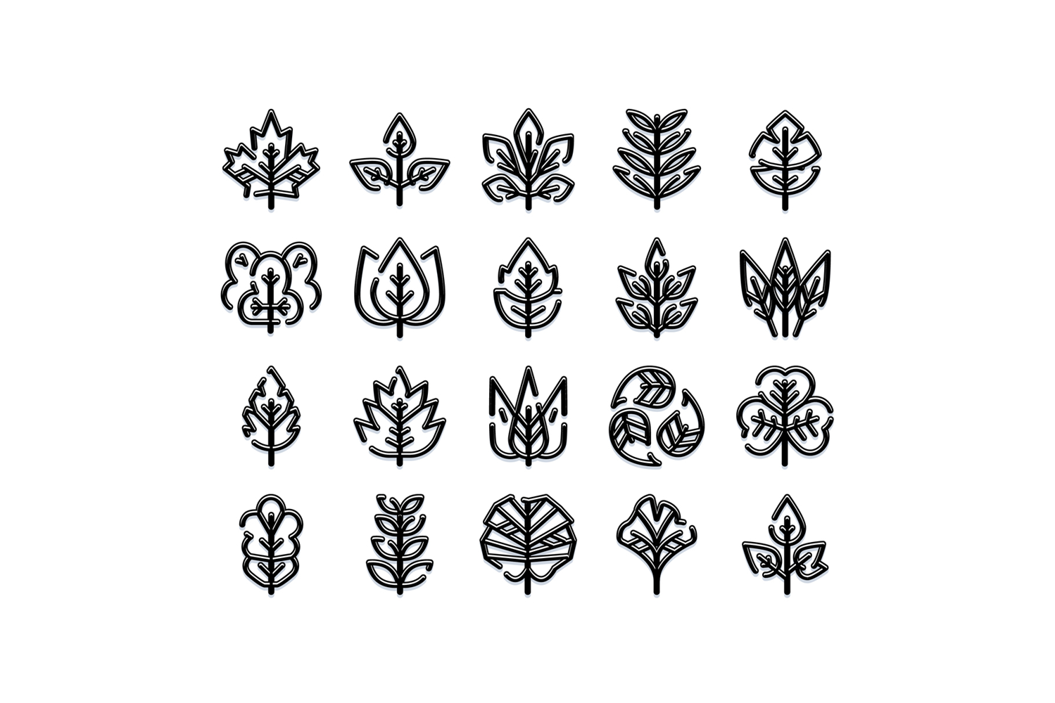 Collection of outline leaf icons with a dark stroke, representing various foliage shapes, plants, nature, and environmental concepts in a simple visual style