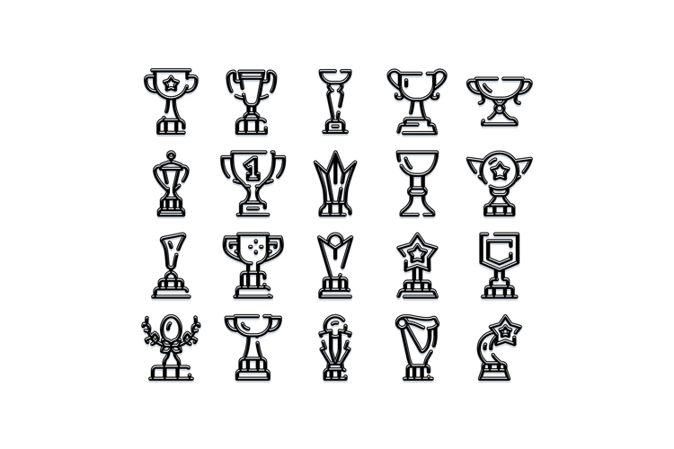Collection of outline icons representing various trophies, awards, and cups, symbolizing success, victory, competition, and first place achievement for business or sports