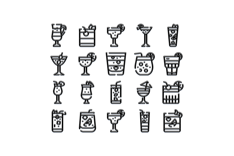 Diverse collection of line art icons depicting various alcoholic and non alcoholic beverages, including mojitos, margaritas, and other mixed drinks, perfect for menus and web designs