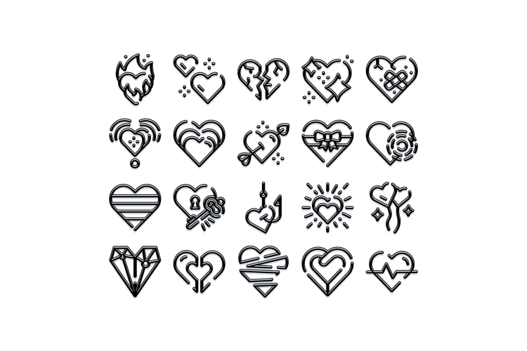 Set of diverse heart outline icons depicting various emotions, relationships, and romantic ideas like broken hearts, love, passion, valentines, and caring connections on a clean white background