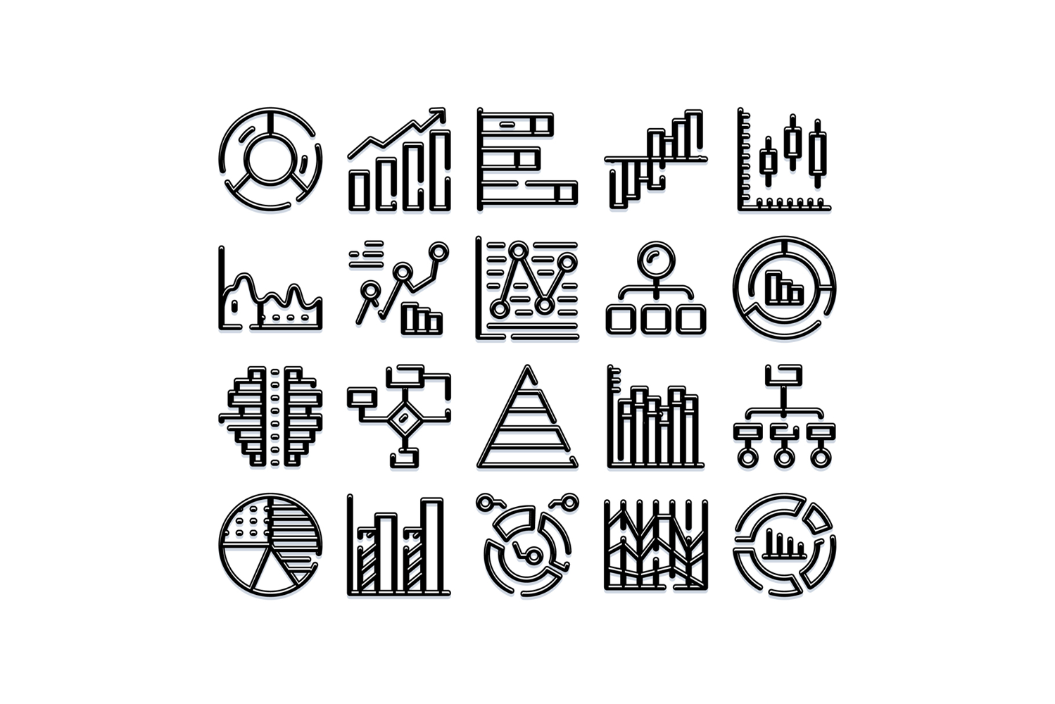 Collection of outline black icons showing various charts, diagrams, and graphic organizers representing business analytics, data visualization, planning, and statistical reporting concepts