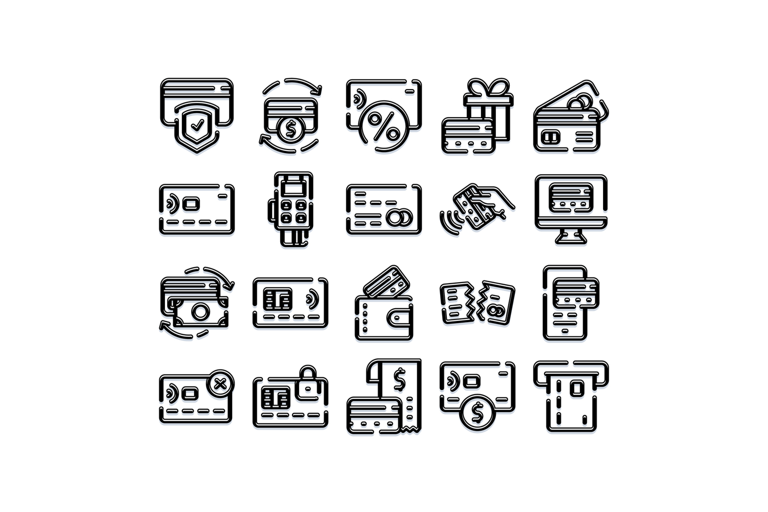 Collection of outline icons illustrating various financial transactions, secure online payments, banking operations, and credit card management for concepts