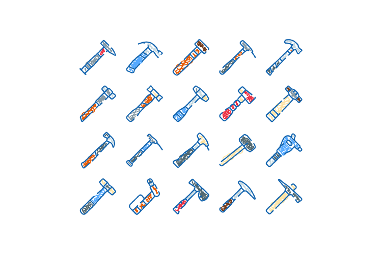 Collection of colorful hammer tools, including claw, club, ball peen, and sledgehammer types, illustrating construction, repair, and woodworking concepts with a sketch style