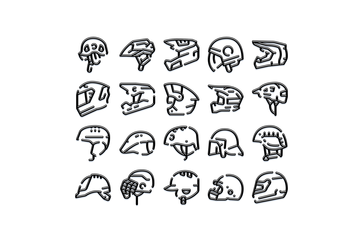 Collection of different helmet types, including sports, motorcycle, and construction gear, illustrating protection, headwear, and safety equipment in a modern line art style