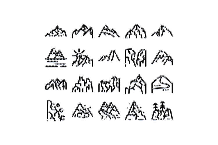 Mountain peaks vector outline icons depicting various natural landscapes, representing concepts of adventure, travel, outdoor activities, hiking, and exploration in nature