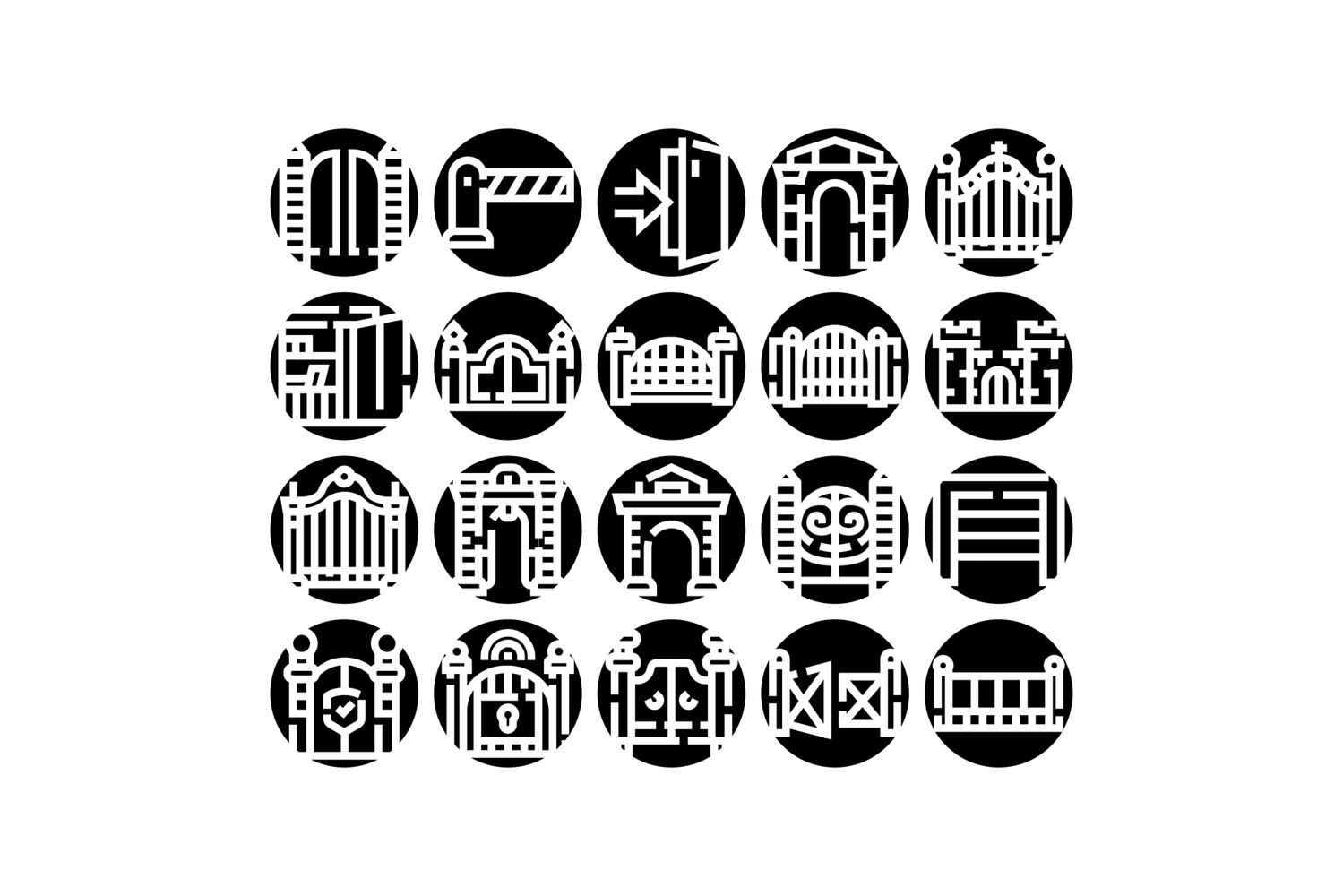 Gate glyph icons illustrating various types of entrances, barriers, and security mechanisms, representing accessibility, protection, and architectural elements for different properties
