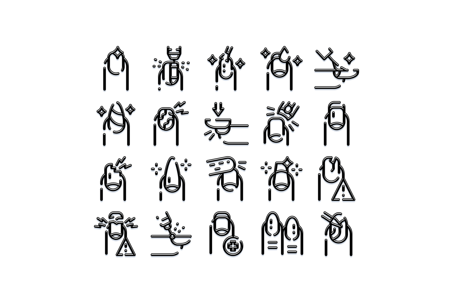 Collection of stylized line icons depicting various aspects of nail care, beauty treatments, cosmetic procedures, and common nail problems, illustrating health and cosmetic solutions