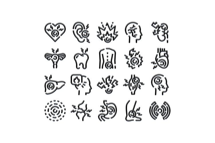 Collection of medical icons illustrating various body parts experiencing pain, discomfort, and symptoms of illness, representing health concerns and physical ailments