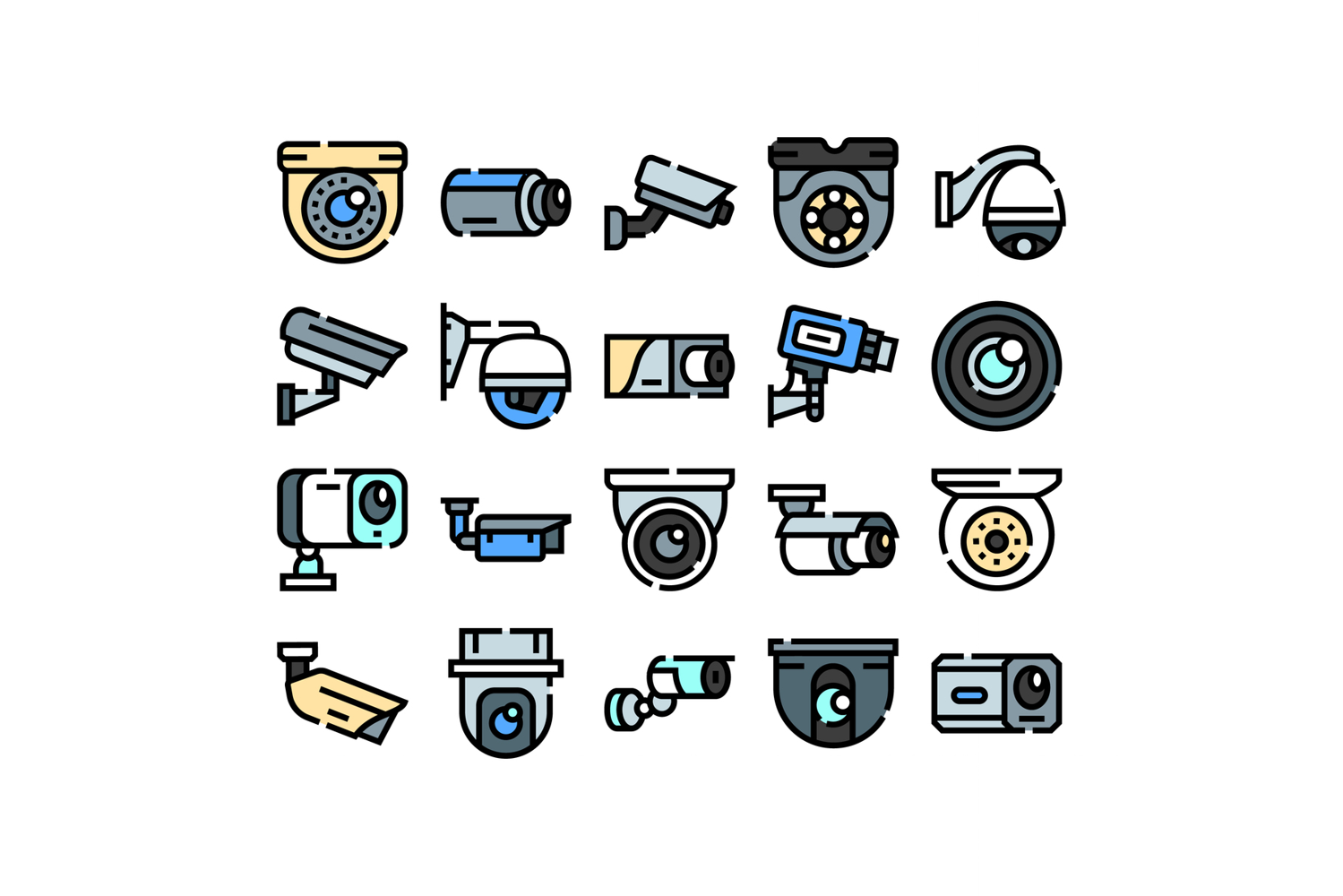 Collection of diverse security cameras icons depicting various types of closed circuit television systems, representing concepts of monitoring, protection, and modern technology in flat line style