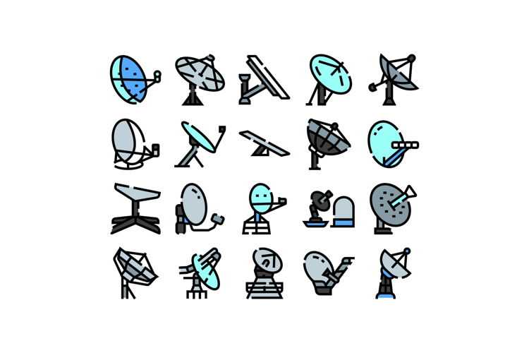 Collection of outline icons symbolizing communication technology, broadcasting, internet connections, and scientific research using satellite dishes, parabolic antennas, and radio telescopes
