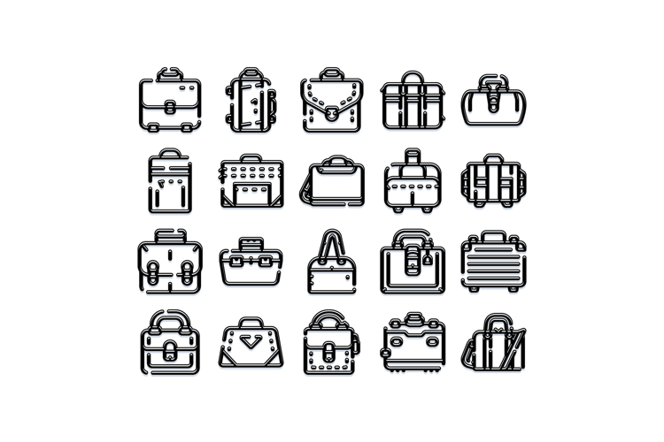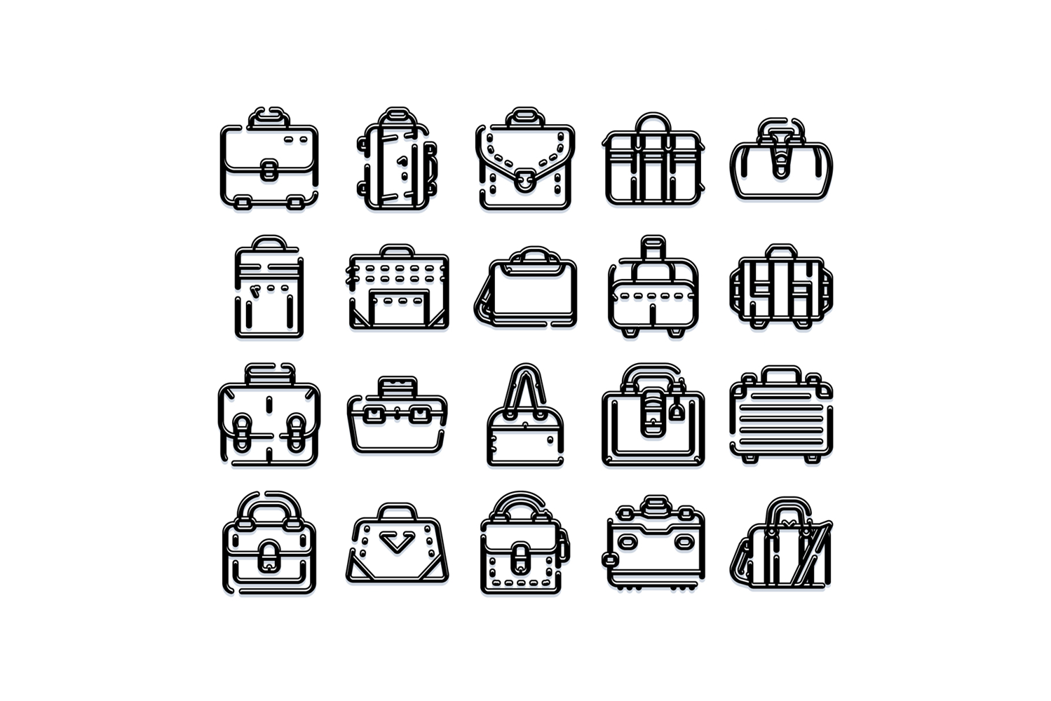 Collection of modern travel bags, suitcases, duffels and briefcases in bold black outline icons on white background, vector set for travel, business, fashion and ui design