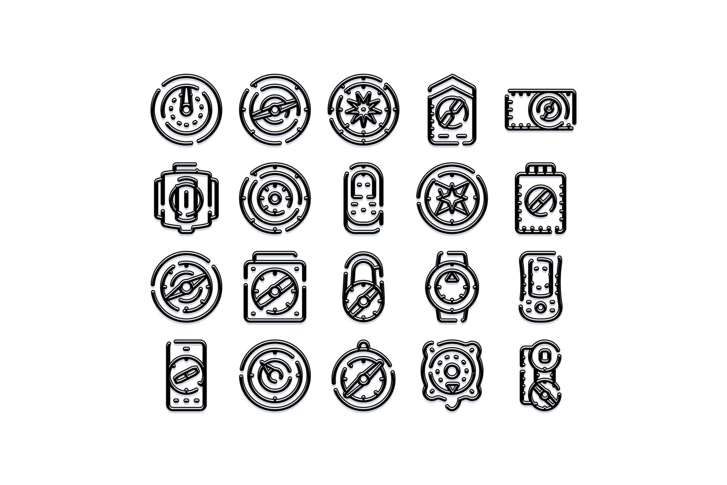 Collection of minimal line art compass icons representing themes of navigation, orientation, wayfinding, travel, adventure, and digital mapping tools for various applications and platforms