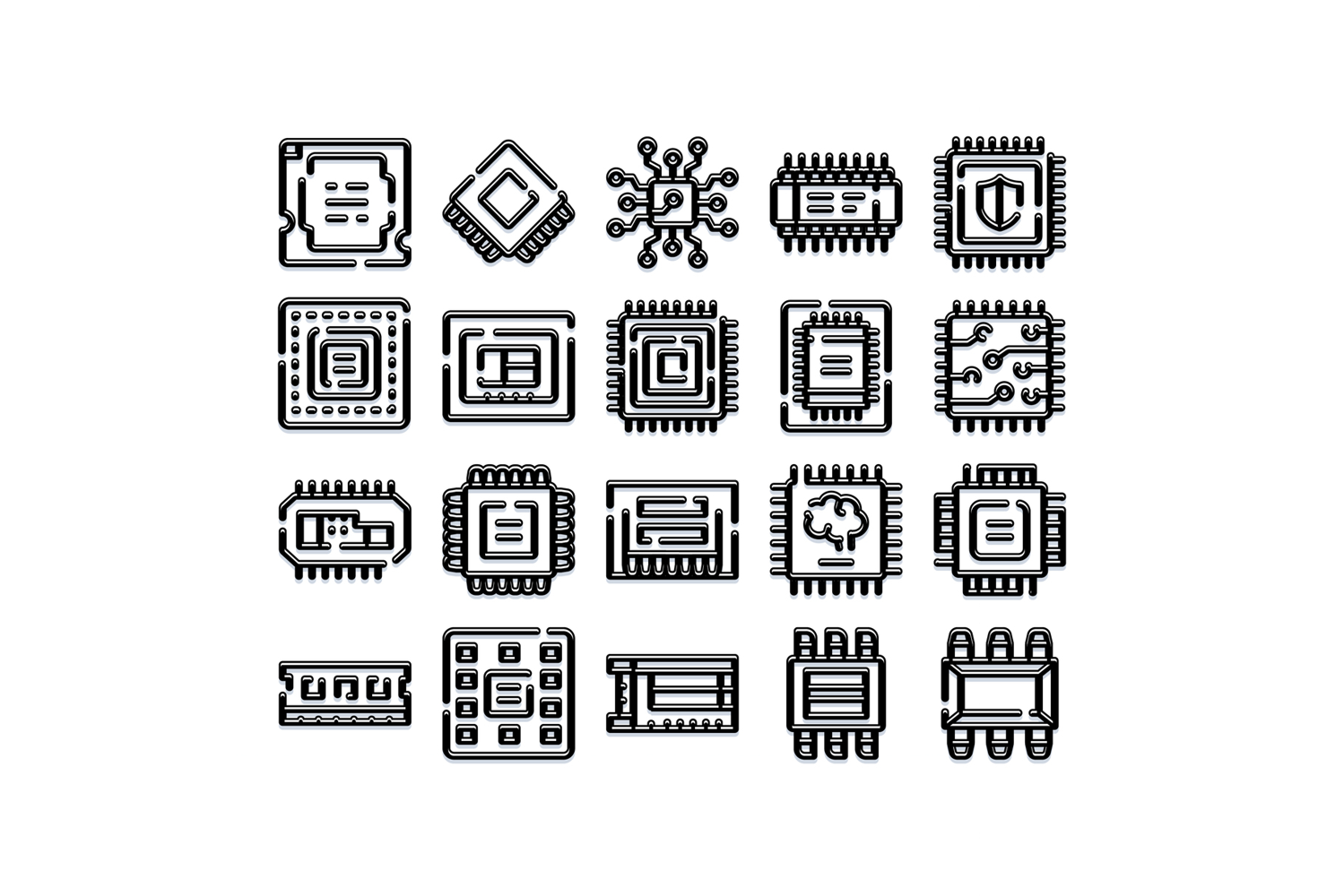 Various microchips, processors, and circuit board components illustrating computing technology, data processing, and hardware engineering in a clean, modern outline style