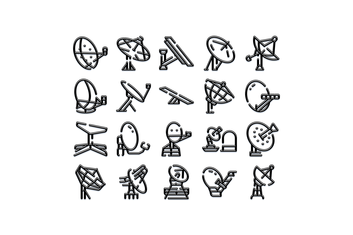 Collection of outline icons featuring various parabolic dishes and communication antennas, representing global connectivity, broadcasting technology, and wireless network transmission