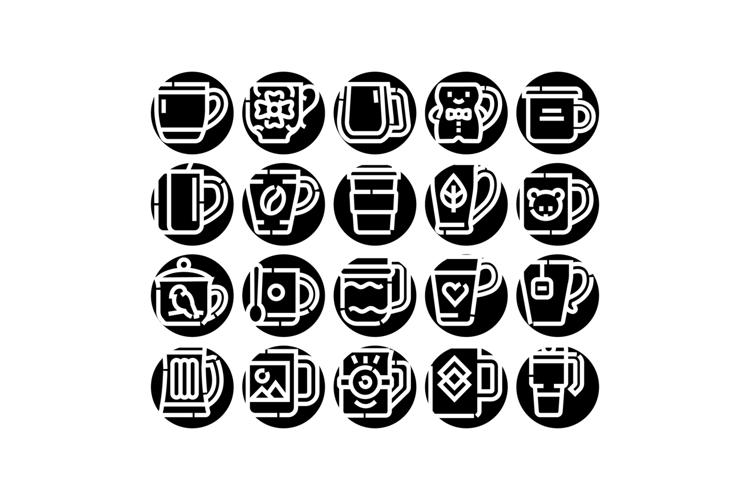 Assortment of different cups and mugs filled with hot beverages, displaying various designs and patterns, creating a diverse icon set for drink menus or digital interfaces