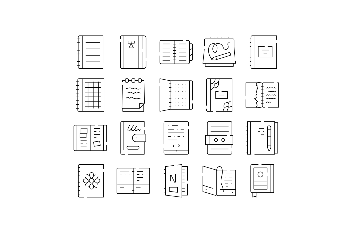 Assortment of linear design icons illustrating various types of notebooks, diaries, journals, and planners, representing education, office supplies, and writing concepts