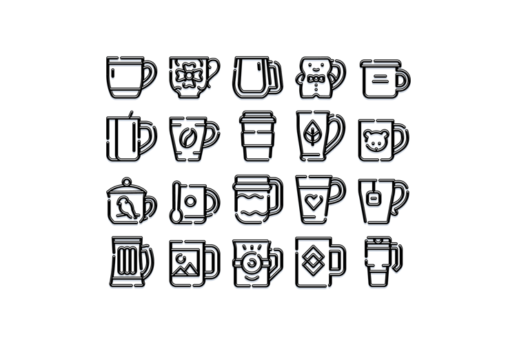 Assortment of linear design icons featuring different styles of mugs, cups, and hot beverage containers, illustrating drinking preferences and variety