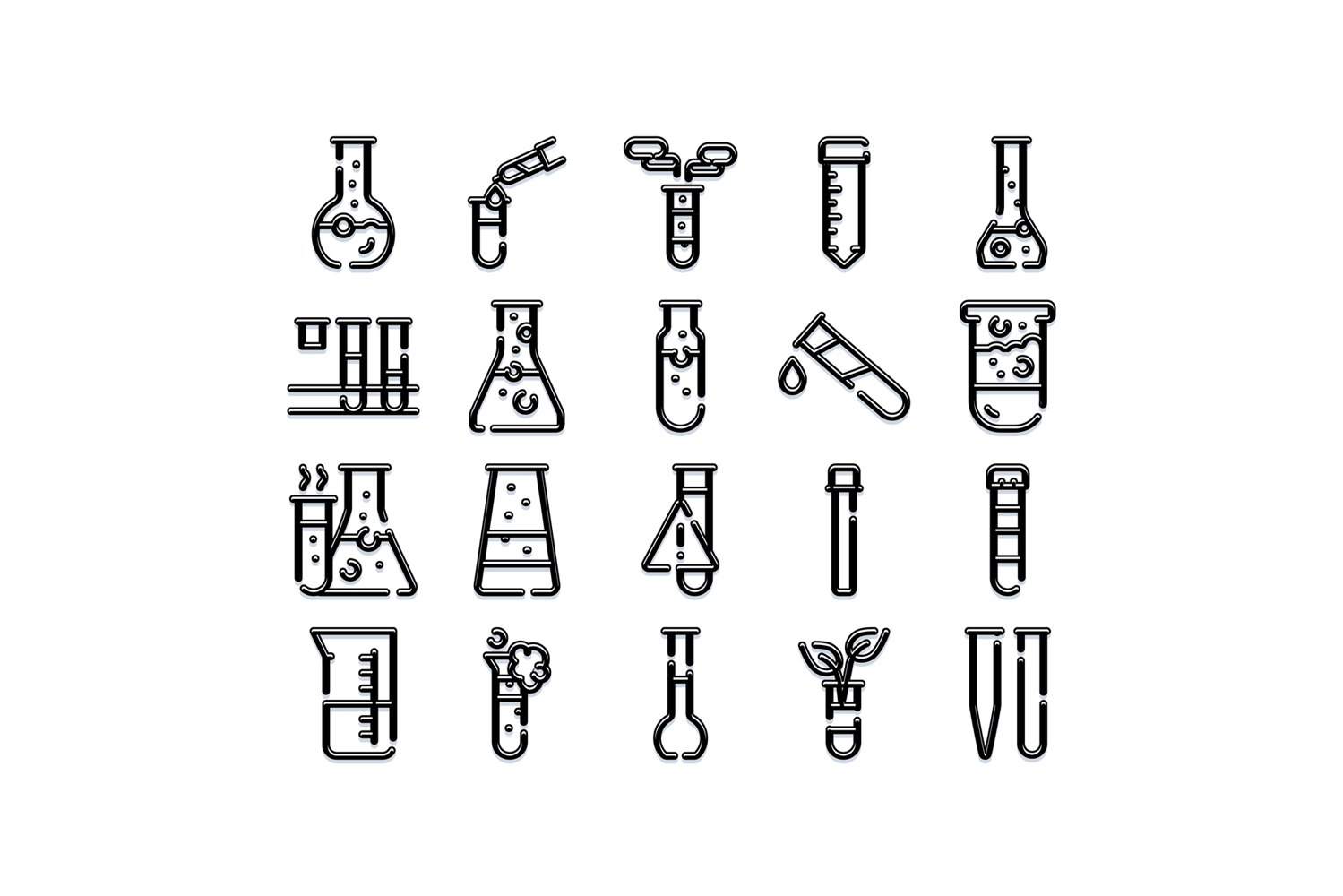 Assortment of linear stroke icons illustrating various laboratory glassware and equipment, representing concepts of science, chemistry, biology, research, and experimentation on a white background