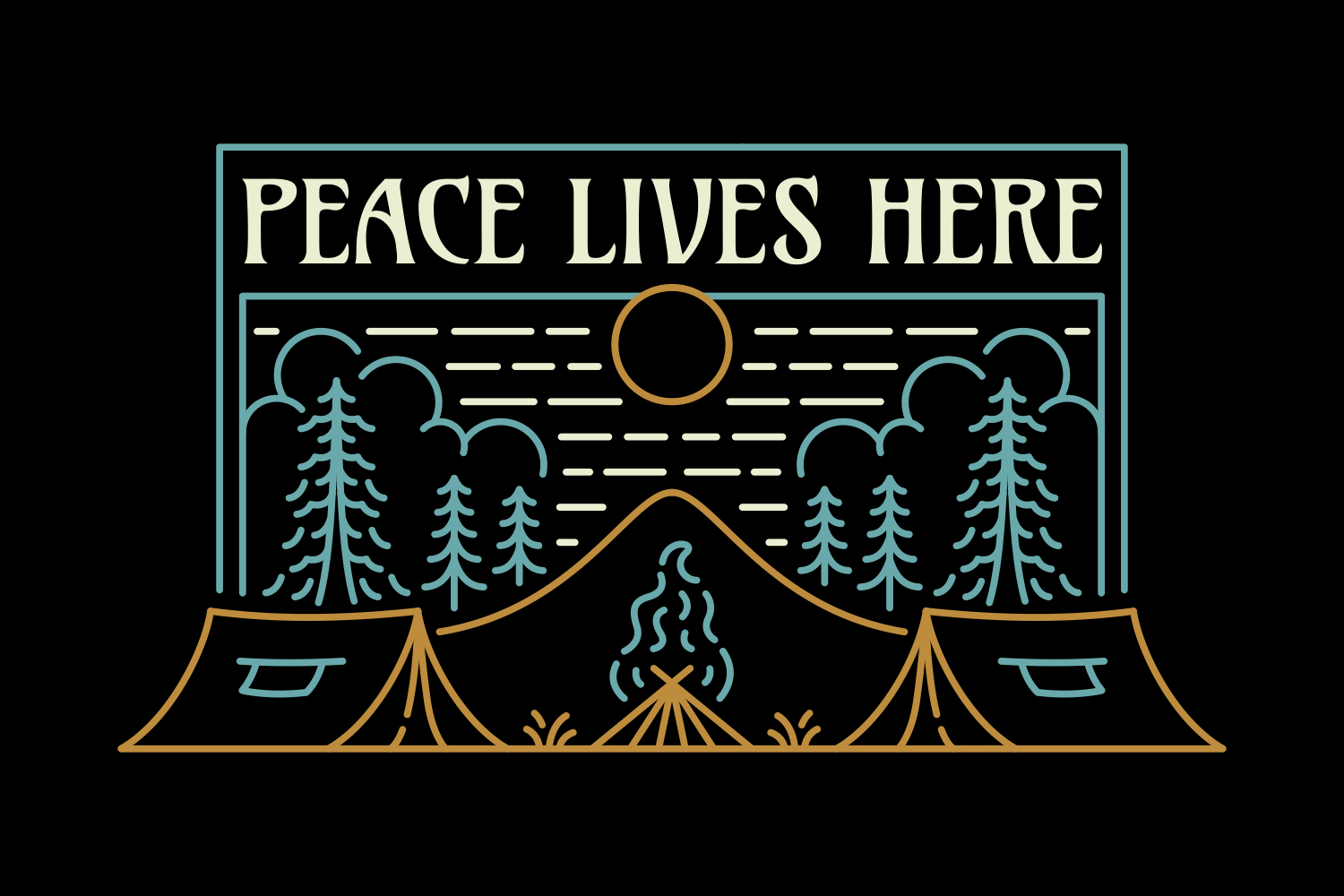 Peace Lives Here is a monoline illustration that is suitable for apparel or merchandise about nature, outdoors, adventure, summer, vacation, holiday, camping, camper, backpacker, tent, hiking, mountain, national park, wildlife, campfire.