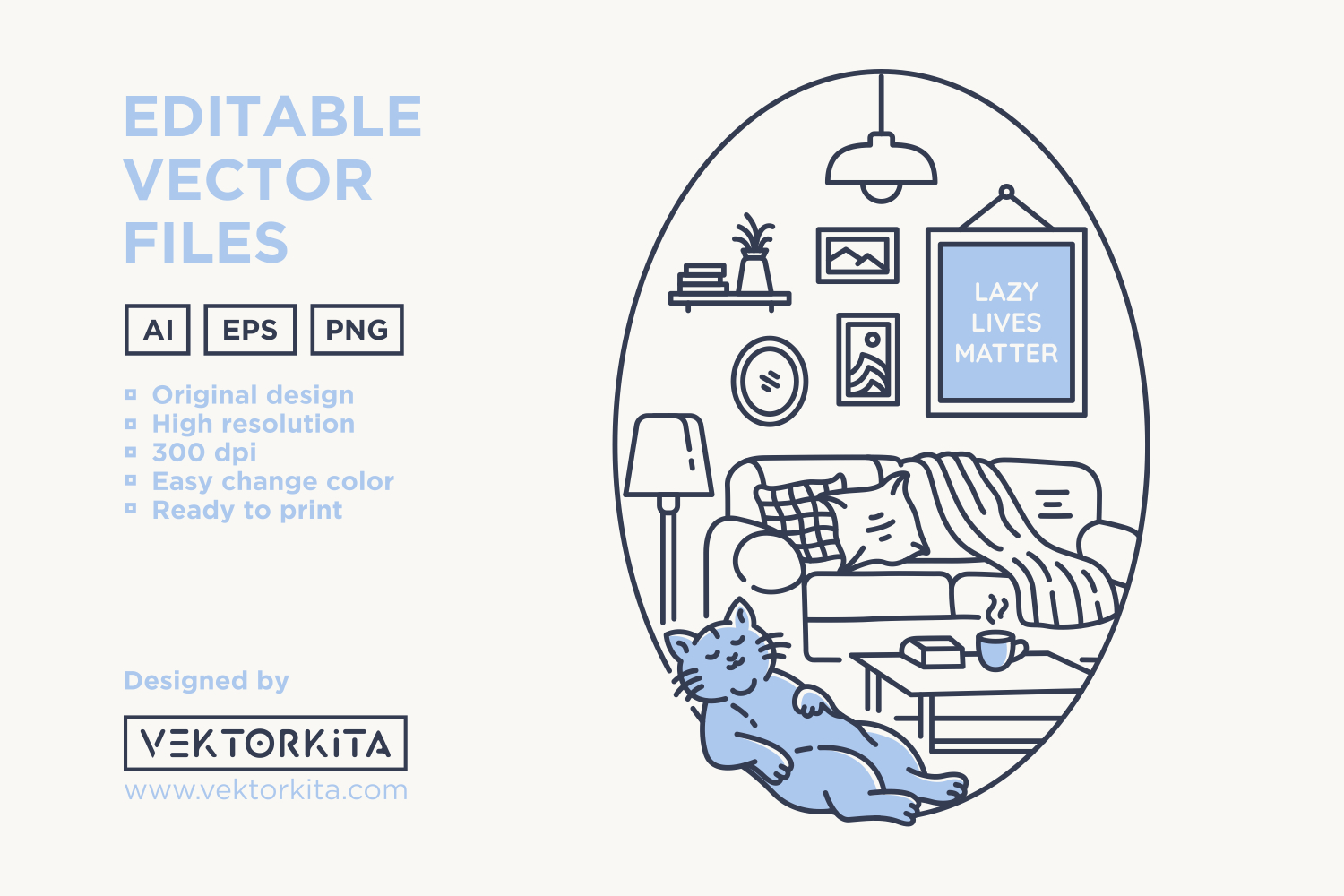 Lazy Lives Matter is a monoline illustration that is suitable for apparel or merchandise about home, homey, cozy, indoors, home sweet home, interior, sleep, lazy, cat, cats, kitten, kitty, pet, funny, animal.