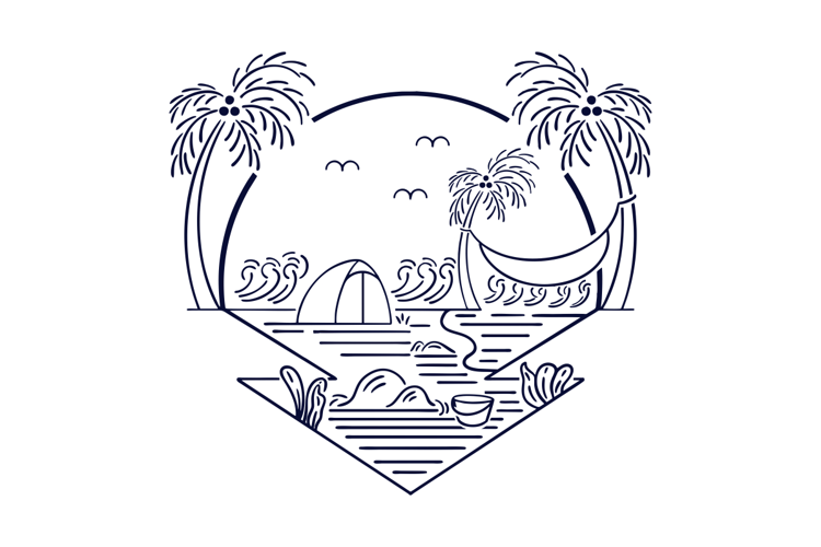 Camping in Heaven is a minimalist line art illustration depicting a peaceful tropical camping scene in paradise. Featuring a tent by the seaside, palm trees, ocean waves, and a relaxing hammock, this artwork perfectly captures the feeling of freedom, serenity, and outdoor adventure. Ideal for travel-themed designs, camping apparel, posters, wall art, branding, and lifestyle products, this clean and modern illustration is perfect for summer, vacation, and nature-inspired projects. Suitable for microstock usage such as Adobe Stock, Shutterstock, and Freepik, this design appeals to buyers looking for calm, aesthetic, and timeless outdoor visuals.