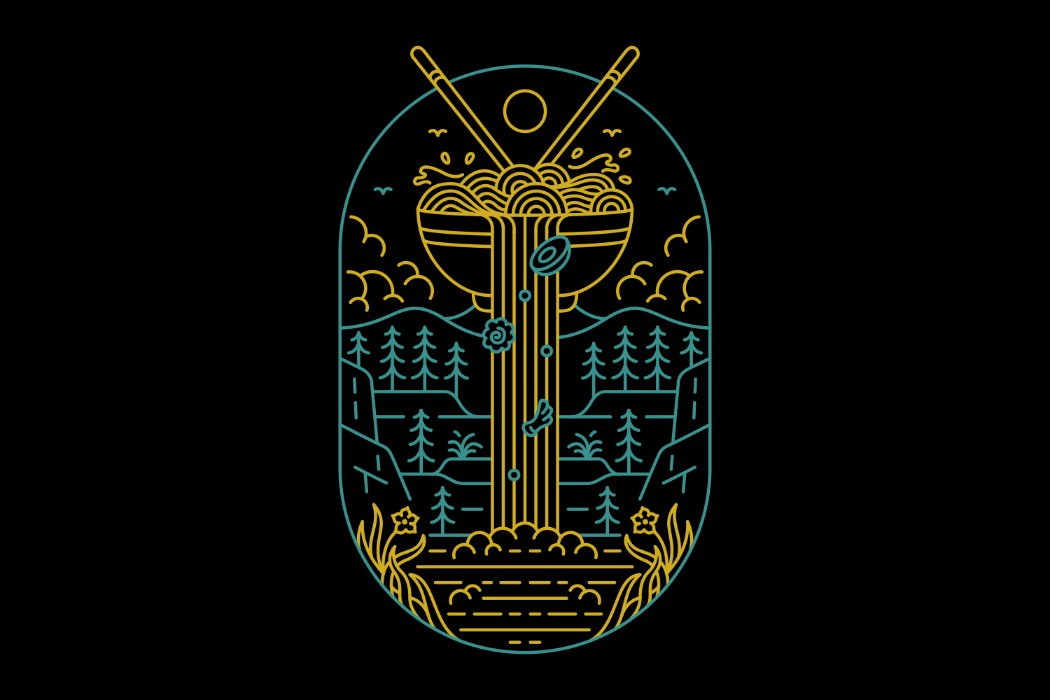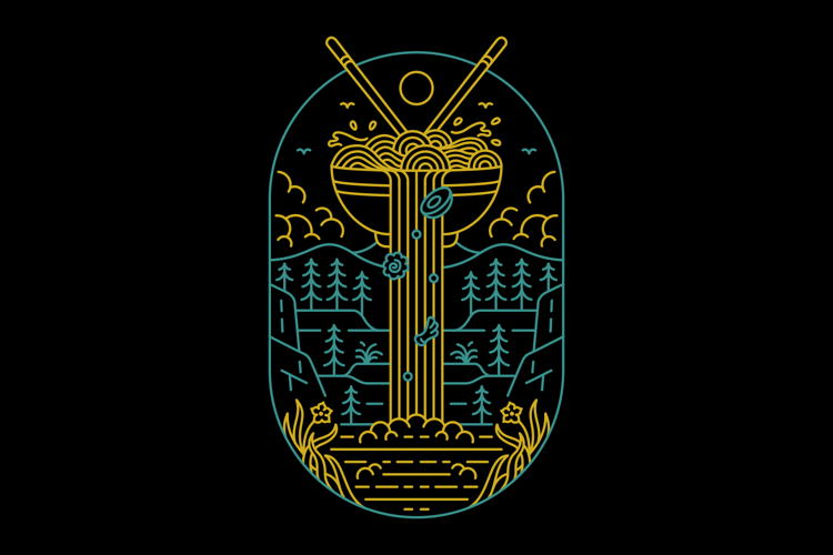 Ramen With a View 3 is a monoline illustration that is suitable for apparel or merchandise about nature, outdoors, adventure, camping, national park, holiday, mountain, backpacker, forest, ramen, noodles, ramen noodles, japanese, food, dessert.