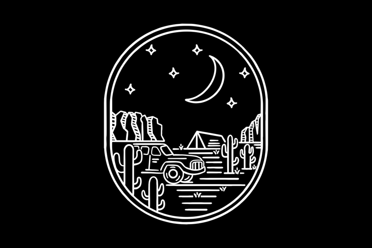 Camping on the Beach is a minimalist monoline illustration depicting a peaceful seaside camping scene under the night sky. Featuring a tent, car, crescent moon, stars, and coastal landscape elements, this artwork captures the calm atmosphere of outdoor adventure by the ocean. Perfect for travel posters, apparel designs, wall art, stickers, branding, and digital or print projects related to camping, summer vacation, beach lifestyle, and nature exploration. Clean line art style makes it versatile, modern, and easy to adapt for various creative needs.