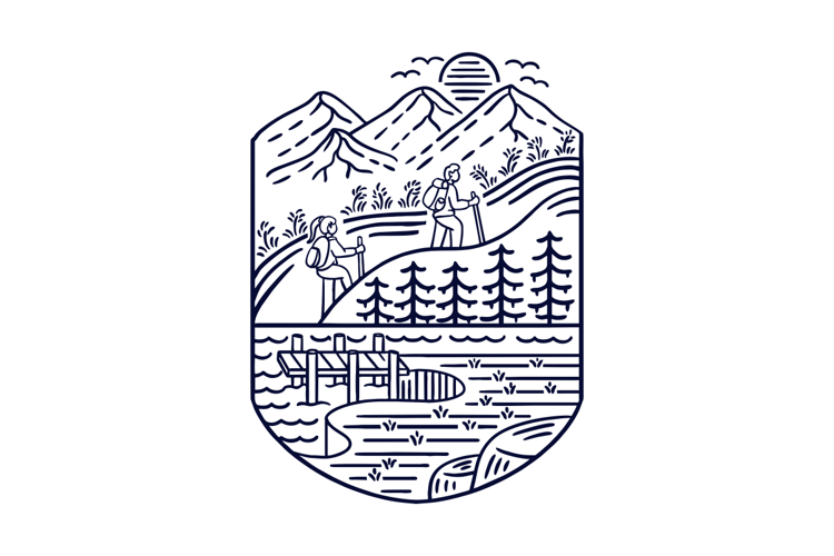 Fun Hiking illustration featuring people hiking through a beautiful mountain landscape with forests, rivers, and scenic nature elements. This clean line art vector style design is perfect for outdoor, adventure, and travel-themed projects. Ideal for posters, t-shirt designs, merchandise, website banners, mobile apps, editorial content, and branding related to hiking, trekking, camping, and outdoor lifestyle. Fully editable vector illustration suitable for both print and digital use, capturing the spirit of adventure, exploration, and nature activities.