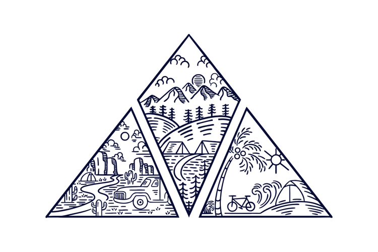 A creative monoline vector illustration titled "Unlimited Adventure." This geometric triangle badge design is divided into three distinct outdoor scenes representing diverse travel destinations. The top section features a mountain camping landscape with pine trees and clouds. The bottom left depicts a desert road trip with a pickup truck, cacti, and rocky cliffs. The bottom right showcases a tropical beach scene with a palm tree, bicycle, and ocean waves. This minimalist line art is perfect for t-shirt prints, travel logos, stickers, merchandise, and tourism branding.