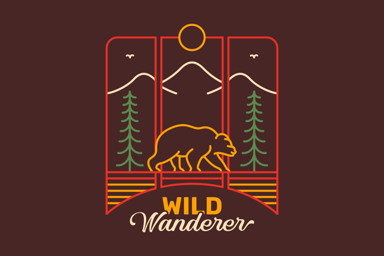 Wild Wanderer is a monoline illustration that is suitable for apparel or merchandise about nature, outdoors, adventure, summer, vacation, holiday, animal, hiking, mountain, national park, wildlife, bear, grizzly, forest, wild.