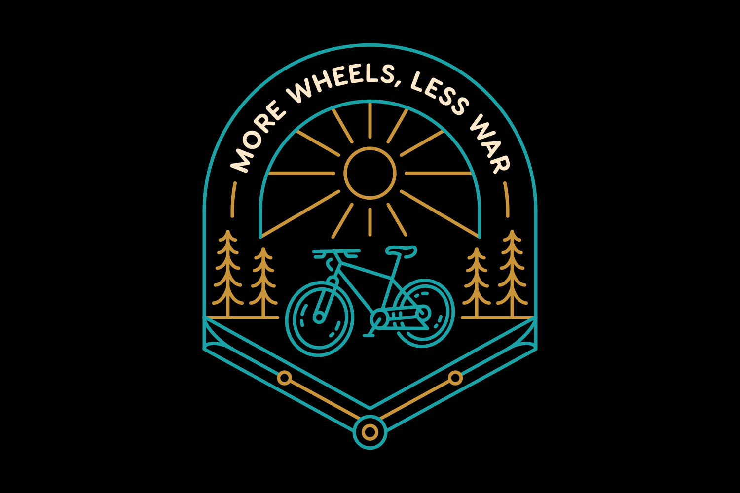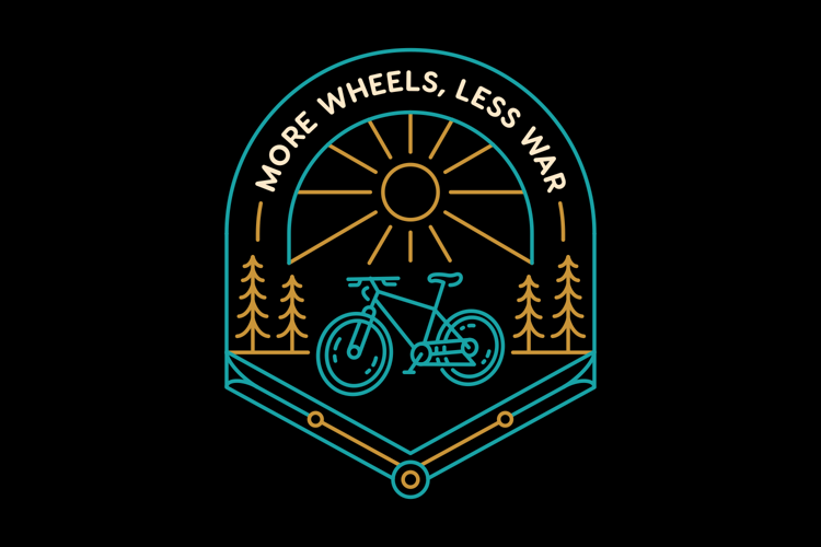 More Wheels Less War 2 is a monoline illustration that is suitable for apparel or merchandise about nature, outdoors, mountain, holiday, bike, biker, bicycle, transportation, sport, travel, war, peace, mountain bike, trip, adventure.