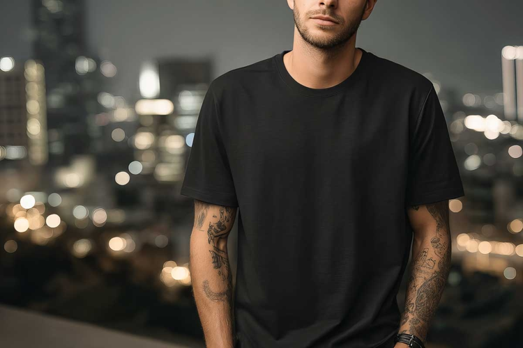 • A man wears a plain black t-shirt mockup front and back 5000x3333px JPG