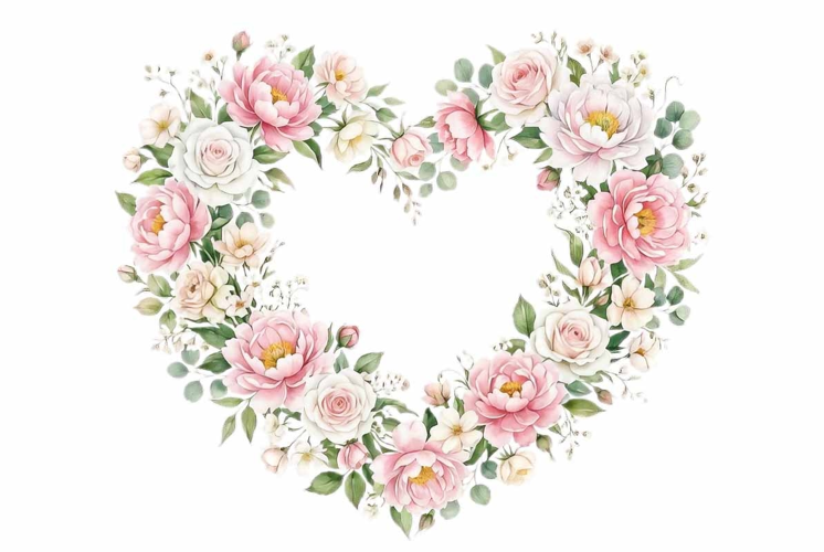 Watercolor heart shape filled with pink and white flowers, roses and peonies, Mother’s Day clipart, isolated on white, transparent background PNG, 300 dpi, high detail 3000px