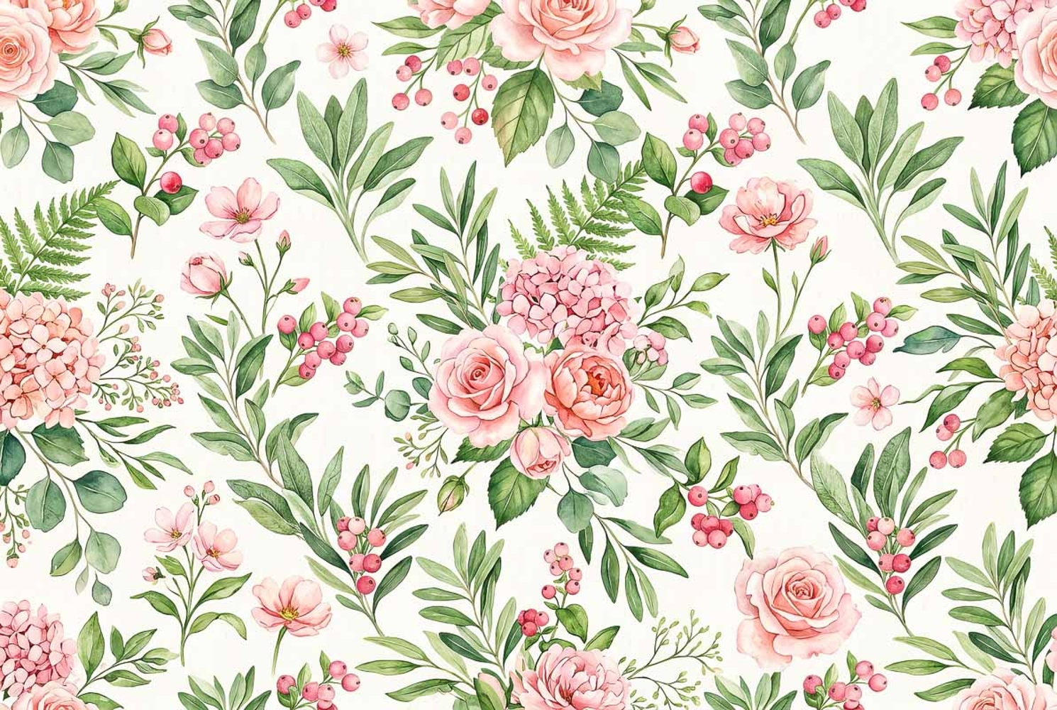 Watercolor seamless repeat pattern with pink peonies, roses and green leaves on white background, Mother's Day surface design, soft pastel palette, high resolution 300 dpi, textile print ready 6000px
