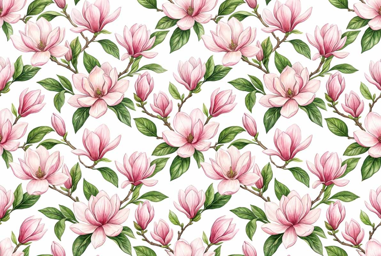 Watercolor seamless pattern with pink magnolia flowers, soft petals and green leaves, elegant spring style, Mother's Day botanical repeat pattern, white background, 300 dpi high detail 6000x4000px