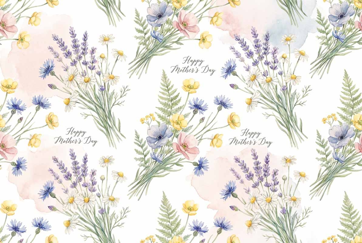 Watercolor seamless pattern with wildflowers, lavender and chamomile, soft cottage core style, Mother's Day botanical repeat pattern, pastel tones, 300 dpi high detail 6000x4000px