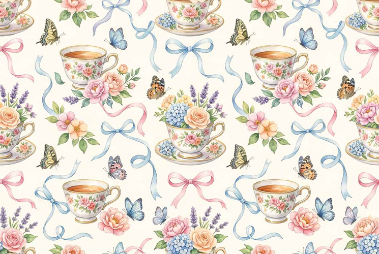 Watercolor seamless Floral Teacups repeat pattern Mother's D