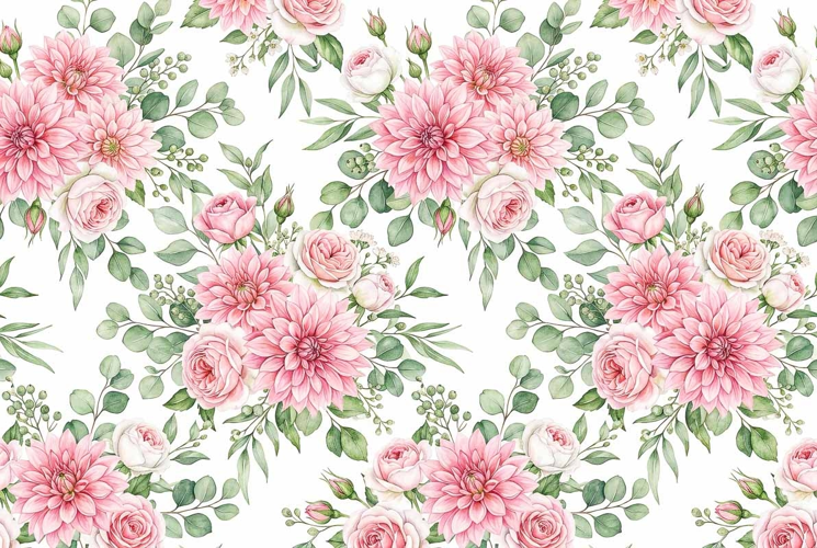 Watercolor seamless repeat pattern with pink peonies, roses and green leaves on white background, Mother's Day surface design, soft pastel palette, high resolution 300 dpi, textile print ready 6000px