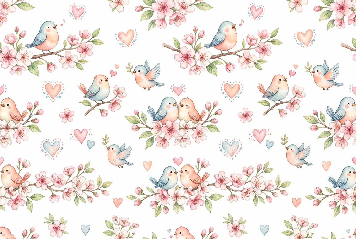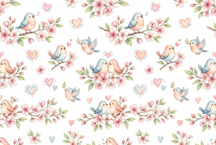 Watercolor seamless pattern with cute birds, rose cherry blossoms and small hearts, sweet romantic style, Mother's Day spring repeat pattern, rose and cream color palette, ivory background, 300 dpi high detail 6000x4000px