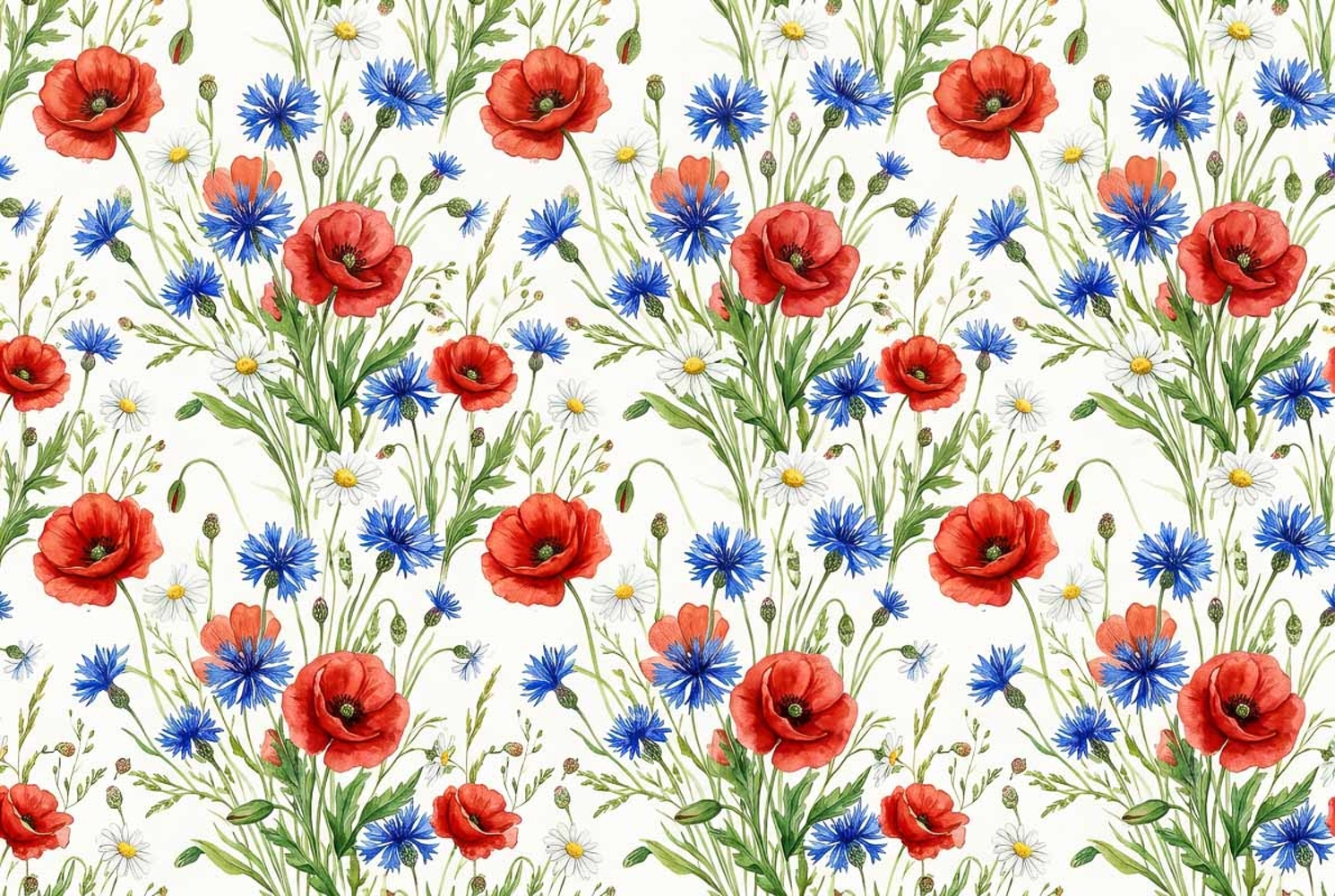 Watercolor seamless pattern with red poppy field blue cornflowers and white daisies, Memorial Day repeat design, 300 dpi, surface pattern design