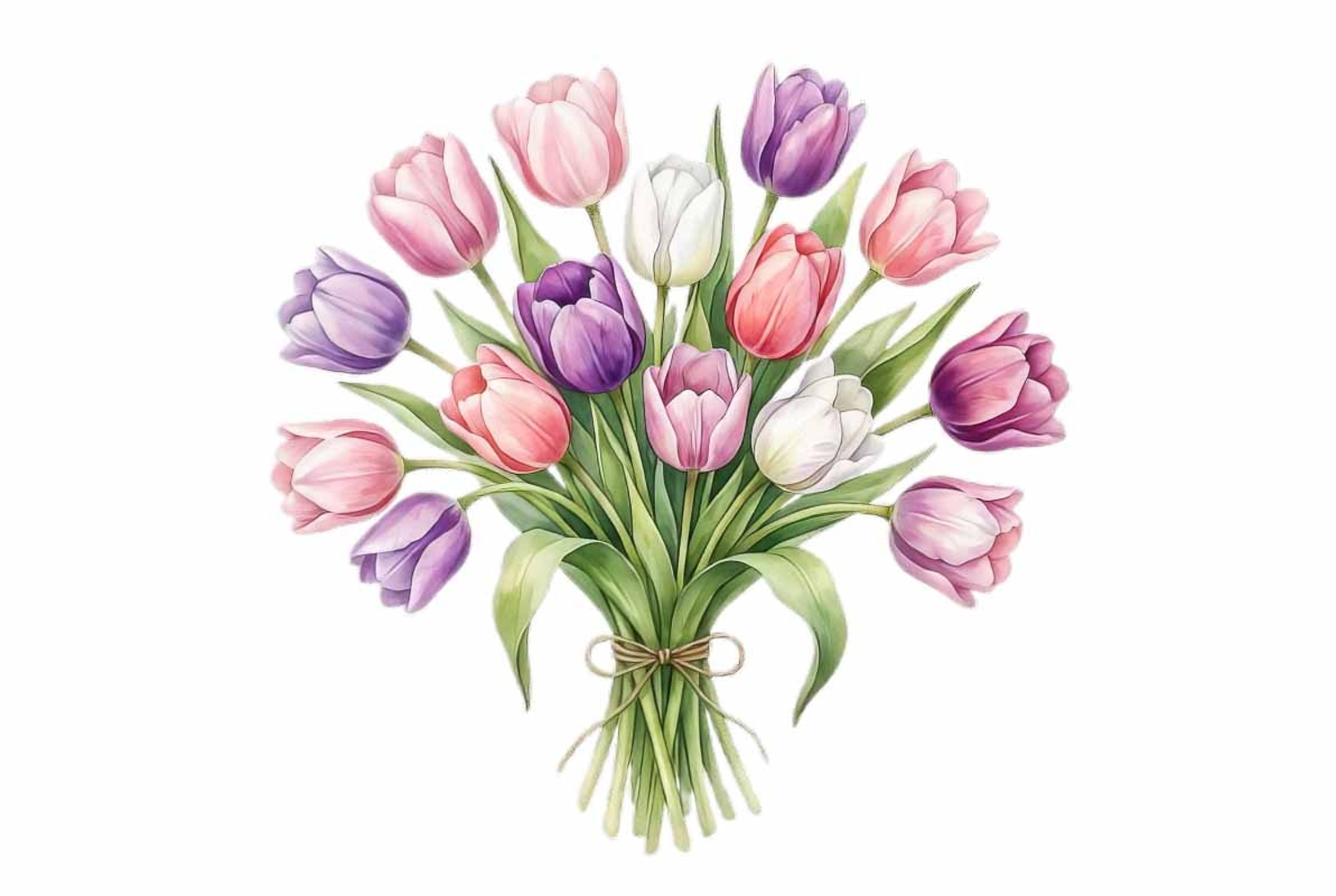 Watercolor fresh tulip bunch, tied with ribbon, spring flowers, Mother's Day clipart, isolated on white, transparent background PNG, 300 dpi, high detail