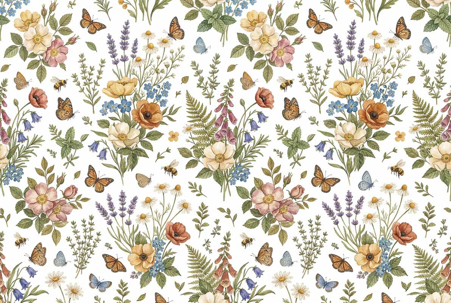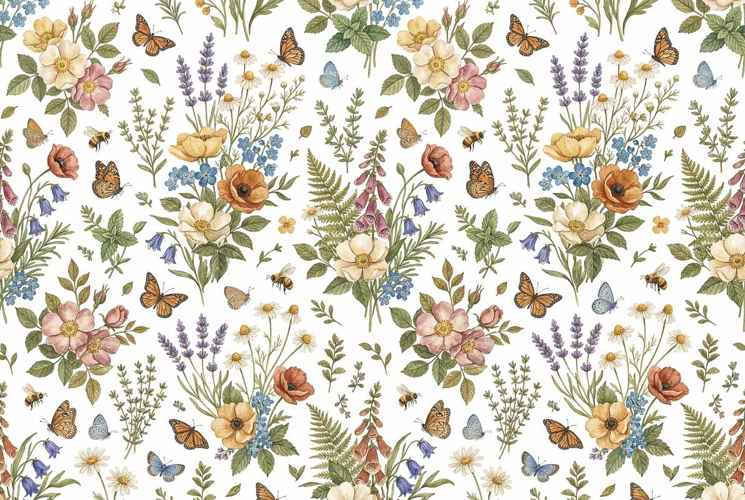 Watercolor Floral Herbs Seamless Pattern Floral Pattern Watercolor Floral Butterflies Wildflowers Mother's Day Bees